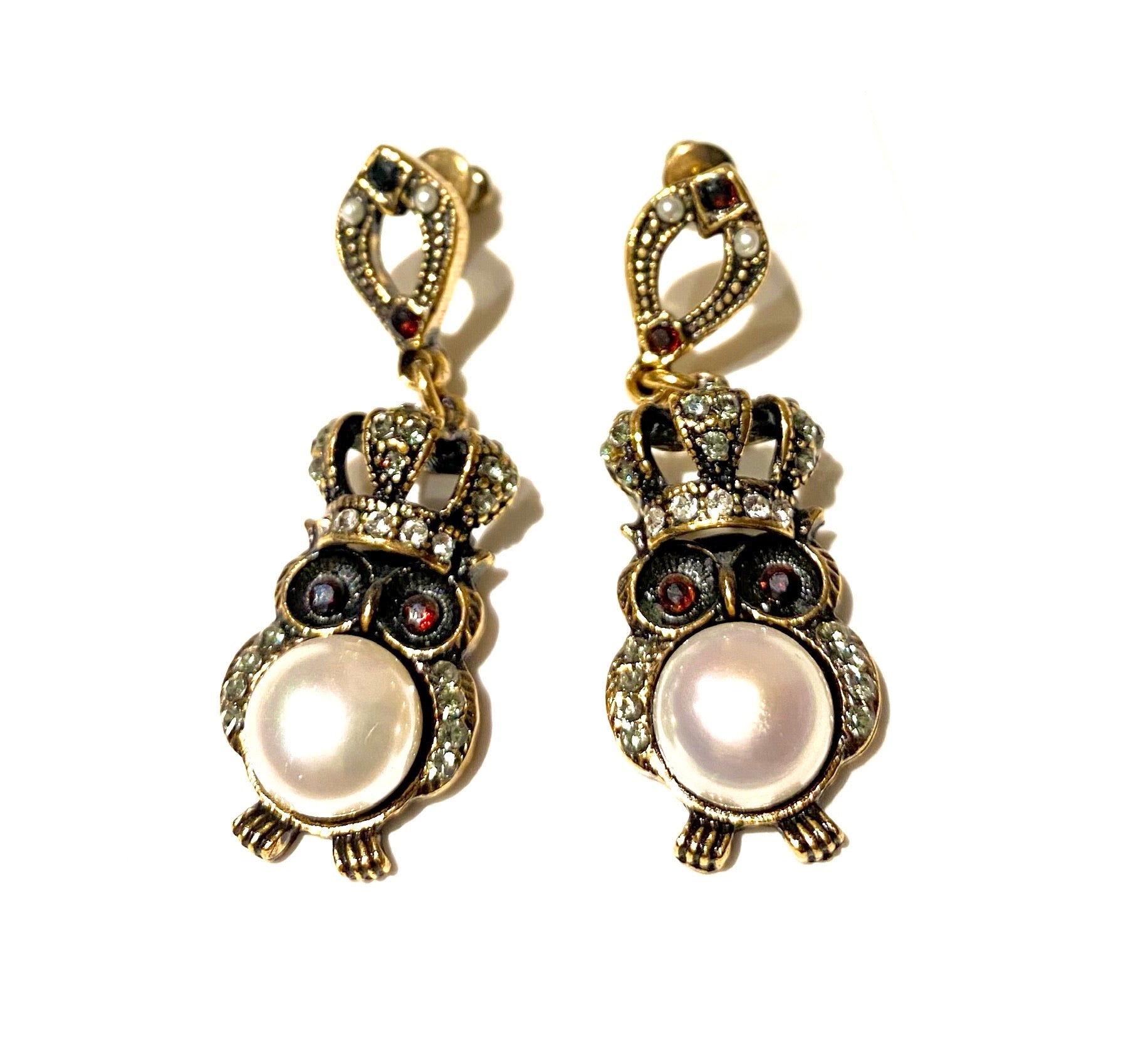 Orecchini in ottone dorato con gufetti,corona e perle in pancia,impreziositi da cristalli swarovsky,granato e perline