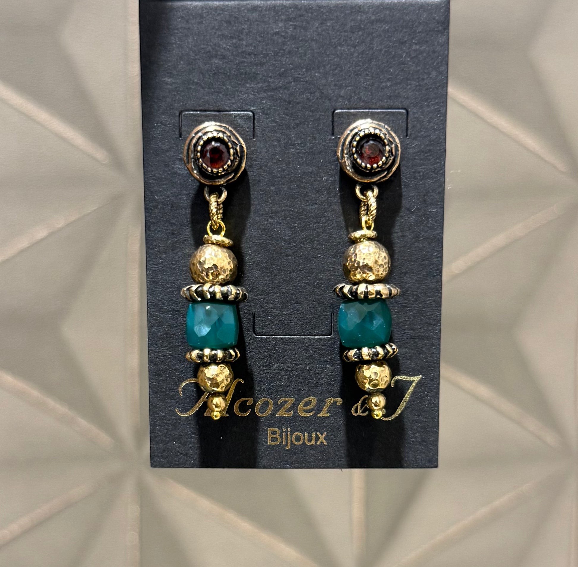 Orecchini realizzati in ottone bagnato oro interamente a mano, con giada verde e granato