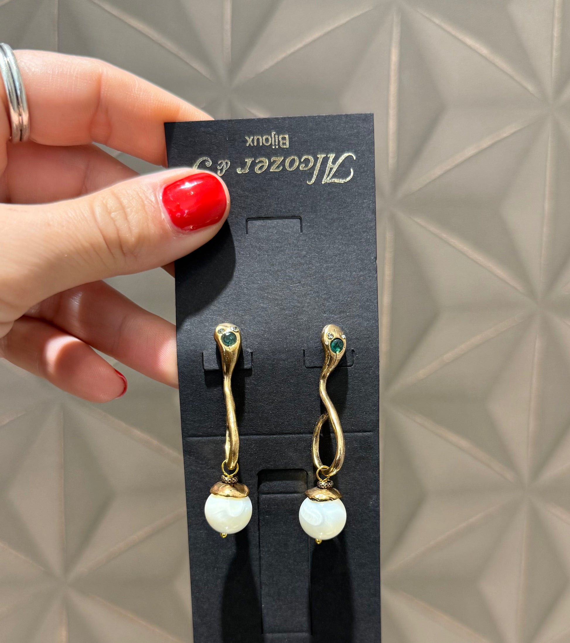 Orecchini realizzati in ottone bagnato oro interamente a mano, con serpente stilizzato,agata e smeraldi