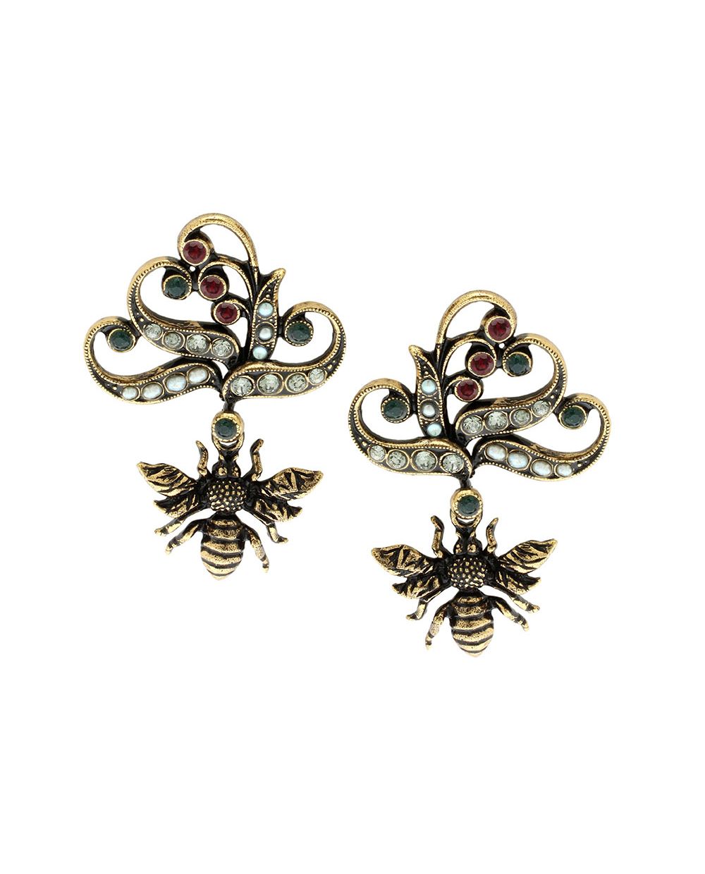Orecchini a perno, in ottone dorato con fiore stilizzato in swarovski, granato, smeraldo e micro-perle da cui scende un ape