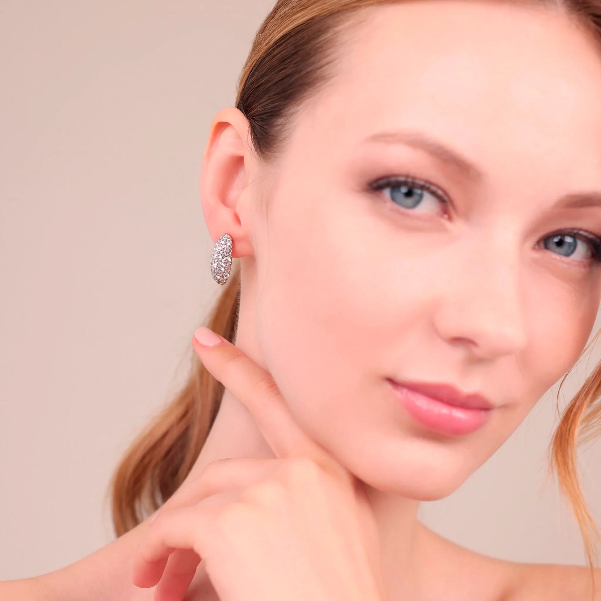 Gli orecchini a lobo, dal design ovale e impreziositi da un pavé di cubic zirconia, riflettono eleganza e femminilità in ogni dettaglio. Perfetti per illuminare il viso con una raffinatezza naturale e senza tempo.