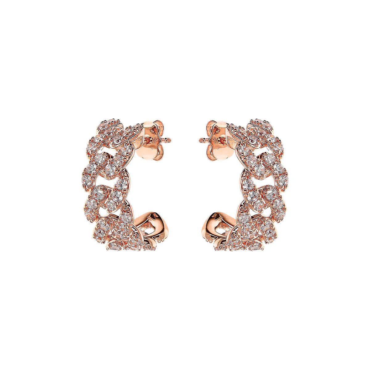Orecchini a lobo Bronzallure realizzati in lega Golden Rosé, placcata Oro rosa 18kt, con catena grumetta squadrata in pavé di cubic zirconia, qualità luminosa. Lunghezza 2 cm. Chiusura a perno e farfalla.