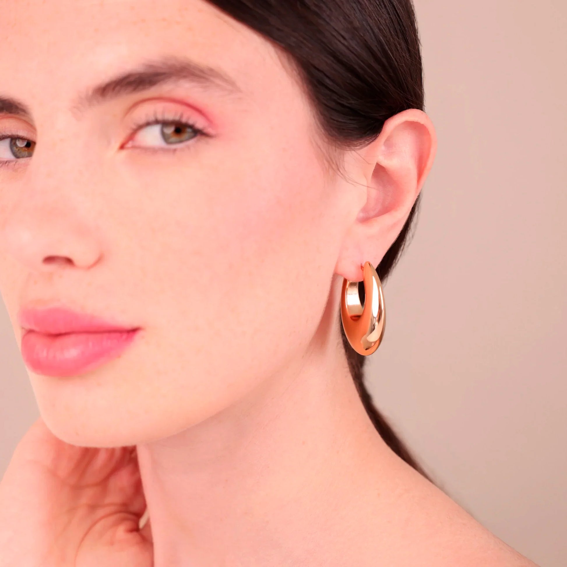 Orecchini a cerchio Bronzallure in Golden Rosé, dal design morbido e leggermente graduato, con finitura lucida che riflette la luce con raffinata brillantezza. Un classico intramontabile rivisitato in chiave contemporanea. Lunghezza: 3,5cm.