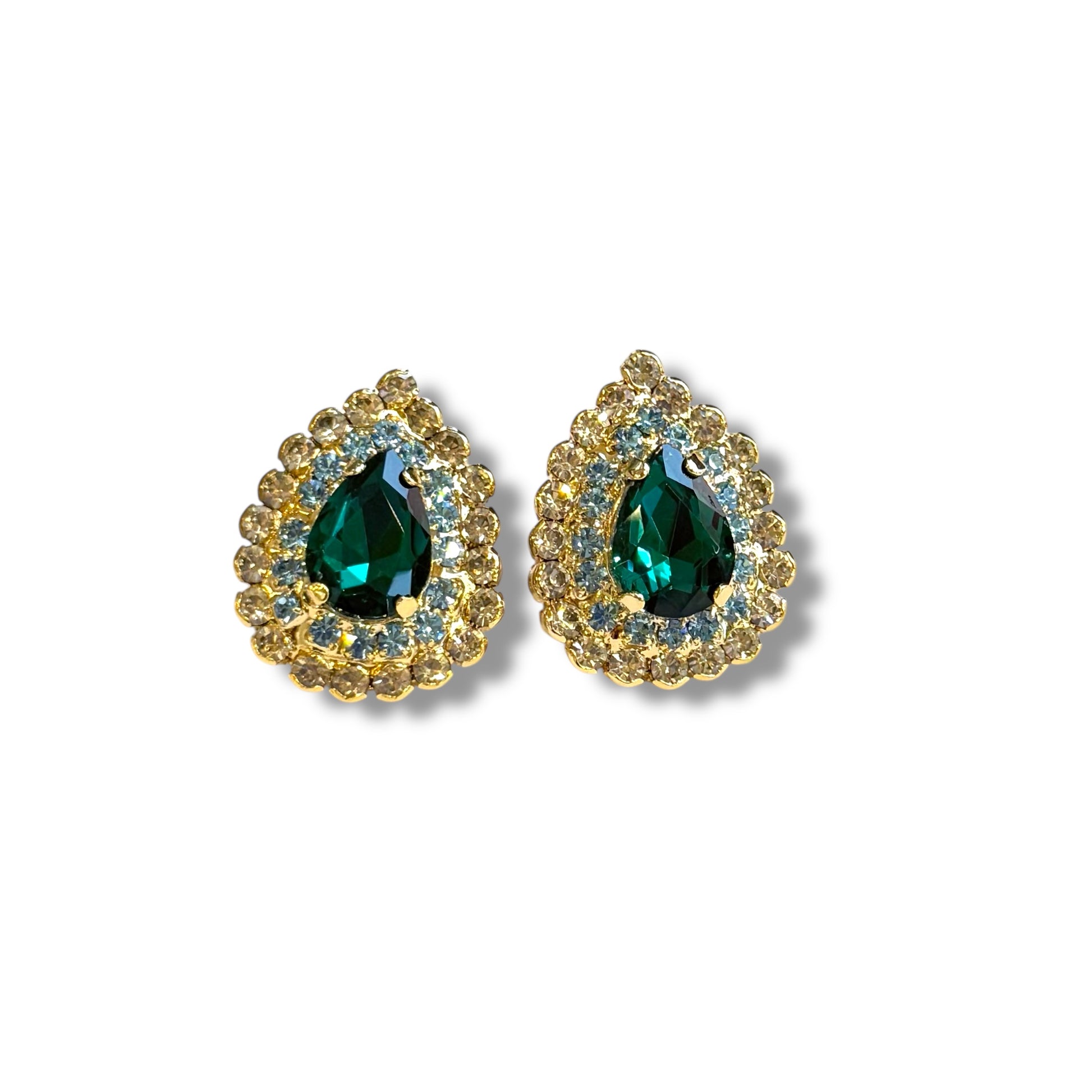 Orecchini a lobo in ottone anallergico con base dorata, con pietre nei colori smeraldo,celeste e crystal.