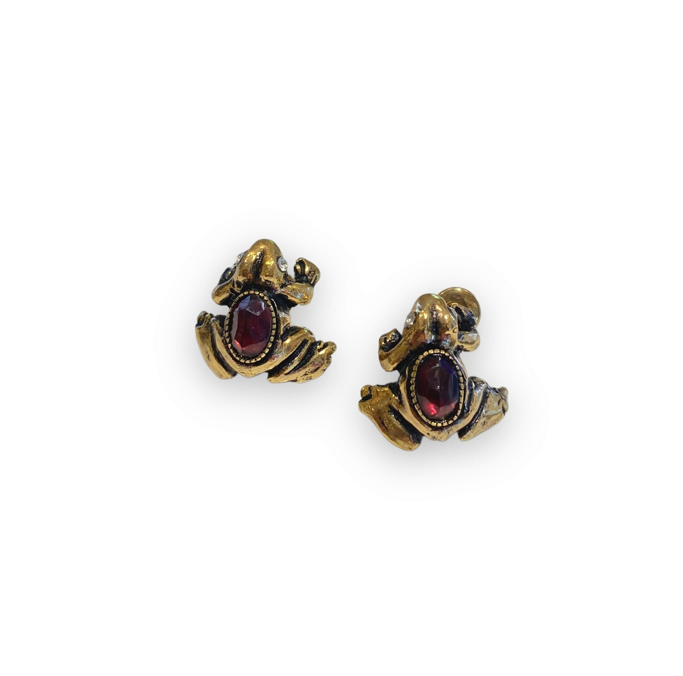 Orecchini in ottone dorato a perno a forma di piccola rana con granato e swarovski. - Dimensione H 1.5cm X L 1.5cm.
