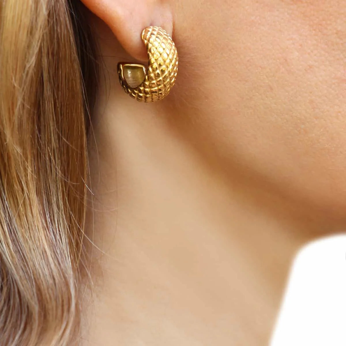 Cerchi spessi con un design in acciaio chirurgico ipoallergenico con texture di pelle di ananas.