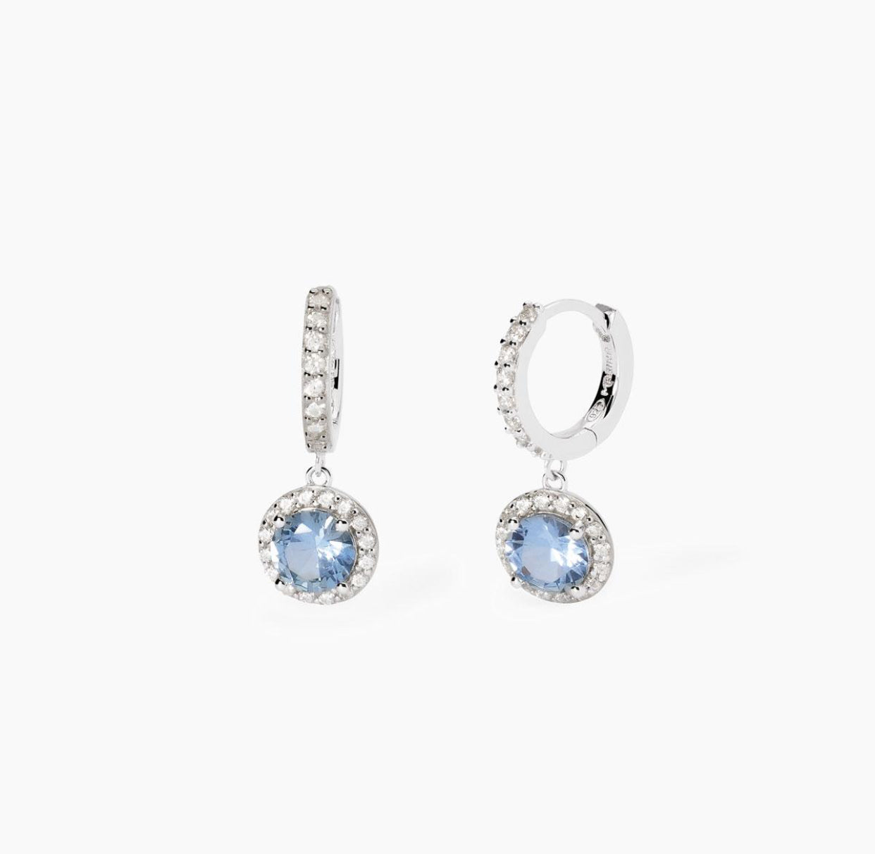 Orecchini da donna in argento rodiato a cerchio con pendente acquamarina sintetica e zirconi.