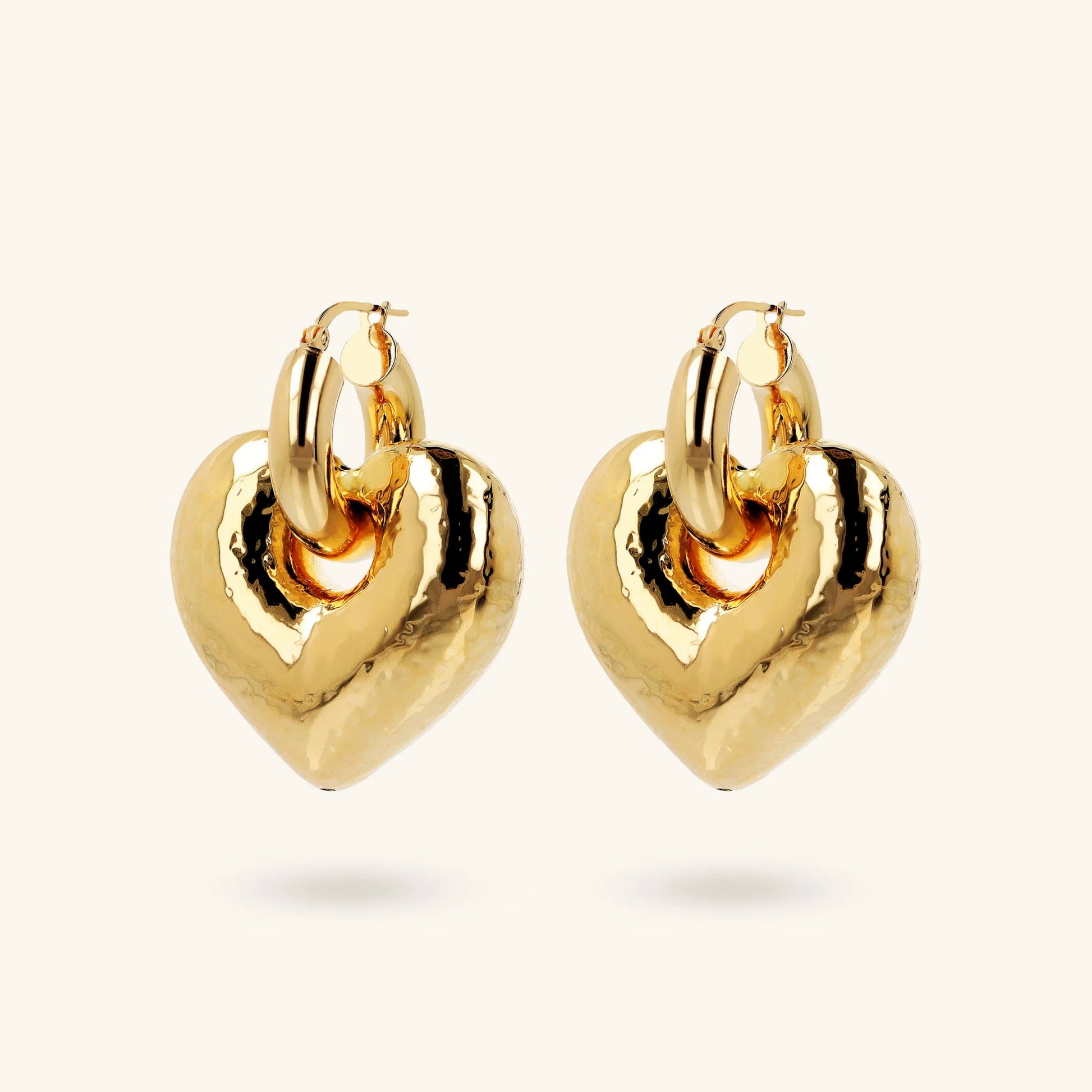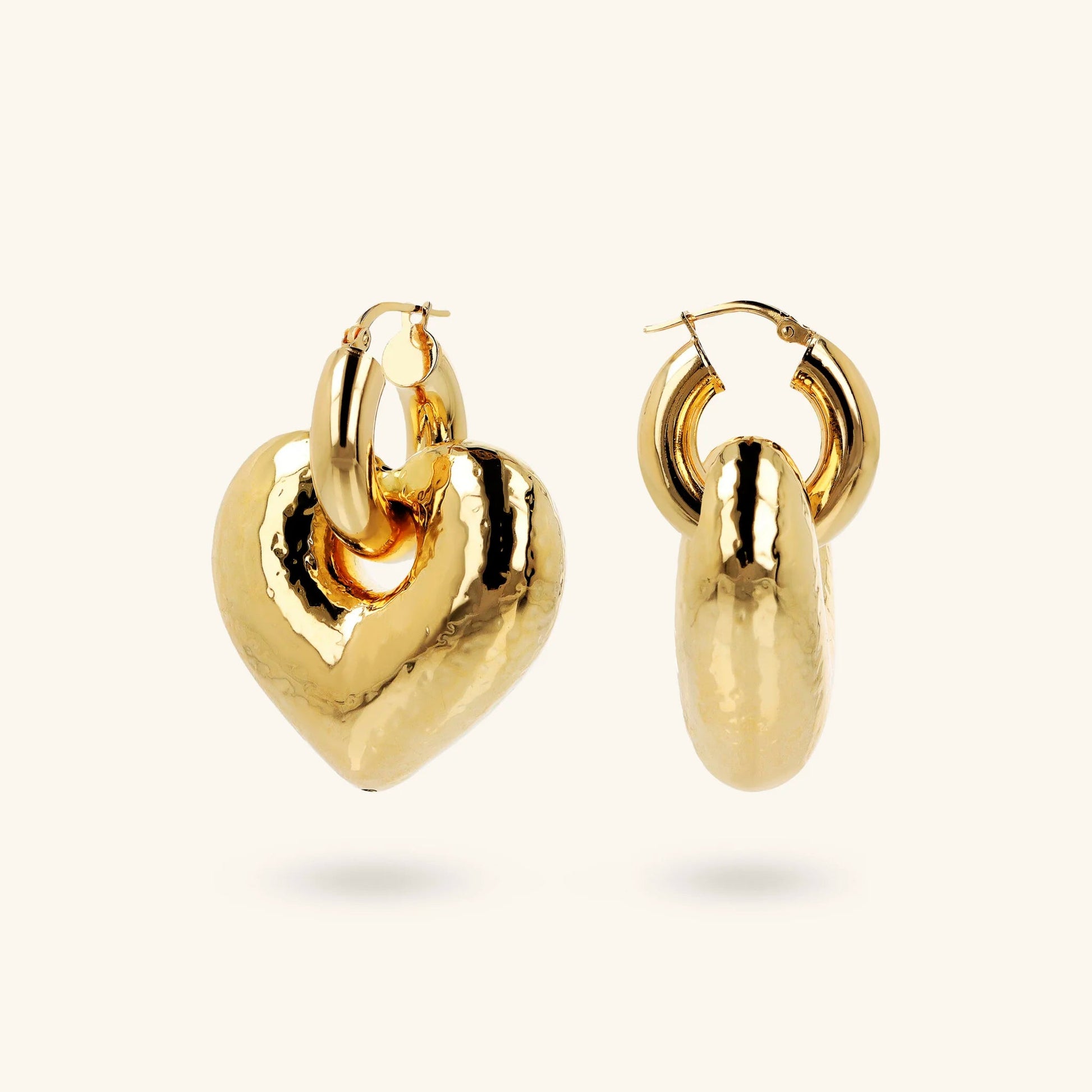 Orecchini a cerchio lucidi Etrusca Gioielli realizzati in lega Golden, placcata Oro giallo 18kt, con pendente martellato rimovibile a forma di cuore bombato. Diametro esterno orecchini 2 cm. Chiusura a baionetta.