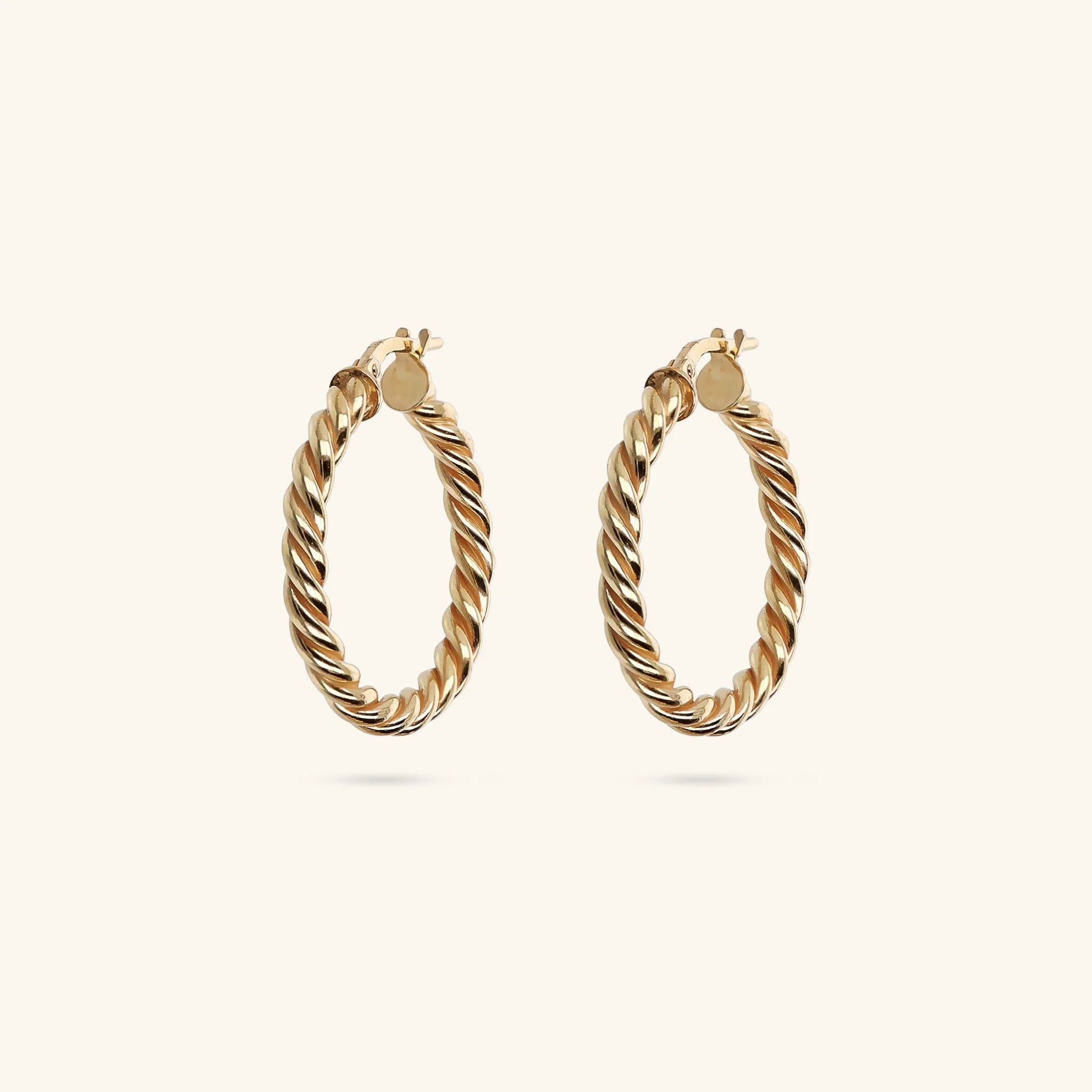 Orecchini a cerchio Etrusca Gioielli realizzati in lega Golden, placcata Oro giallo 18kt, dal desgin a treccia. Spessore 4 cm. Disponibili in tre misure: Small (diametro esterno 2 cm) / Medium (diametro esterno 2.5 cm) / Large (diametro esterno 4 cm).