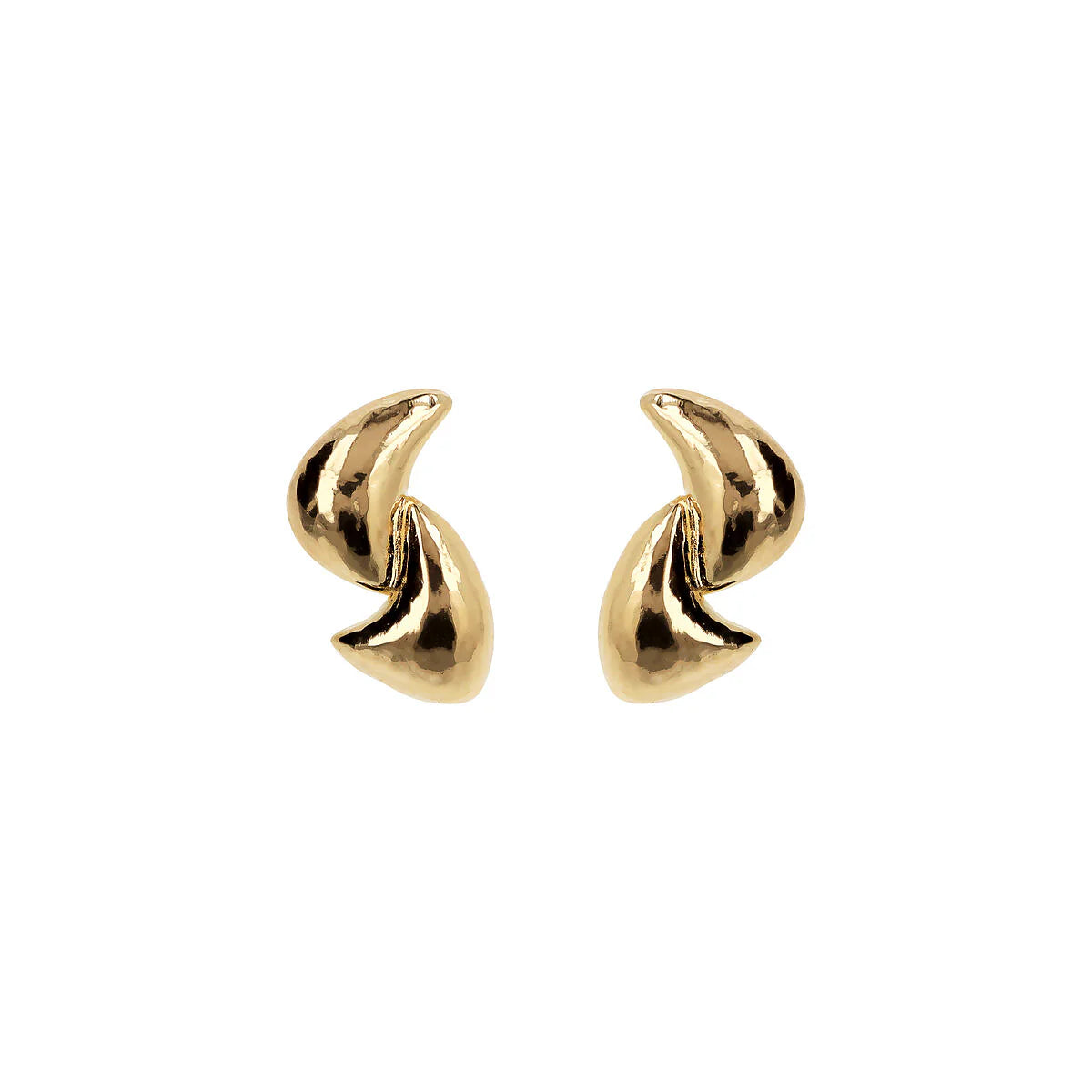 Orecchini a lobo realizzati in lega Golden, placcata oro giallo 18kt, dal design a intreccio con superficie martellata. Chiusura a perno e farfalla.