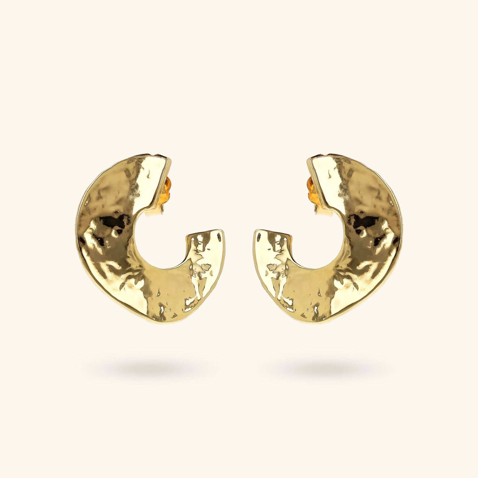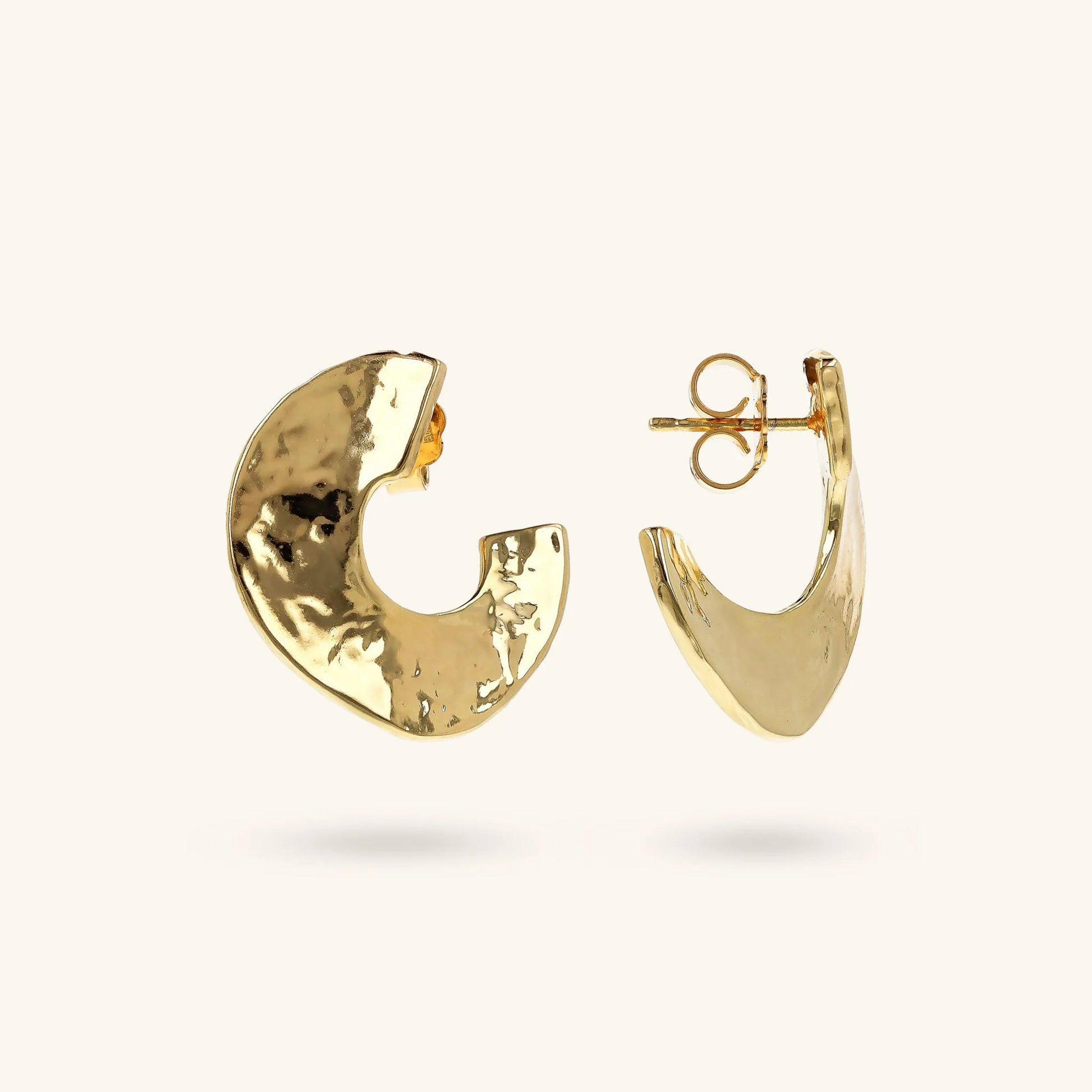 Orecchini a lobo Etrusca Gioielli realizzati in lega Golden, placcata Oro giallo 18kt, dal design a semi-cerchio con superficie martellata. Lunghezza 3 cm. Chiusura a perno e farfalla. Indosso diverso per lato destro e sinistro.