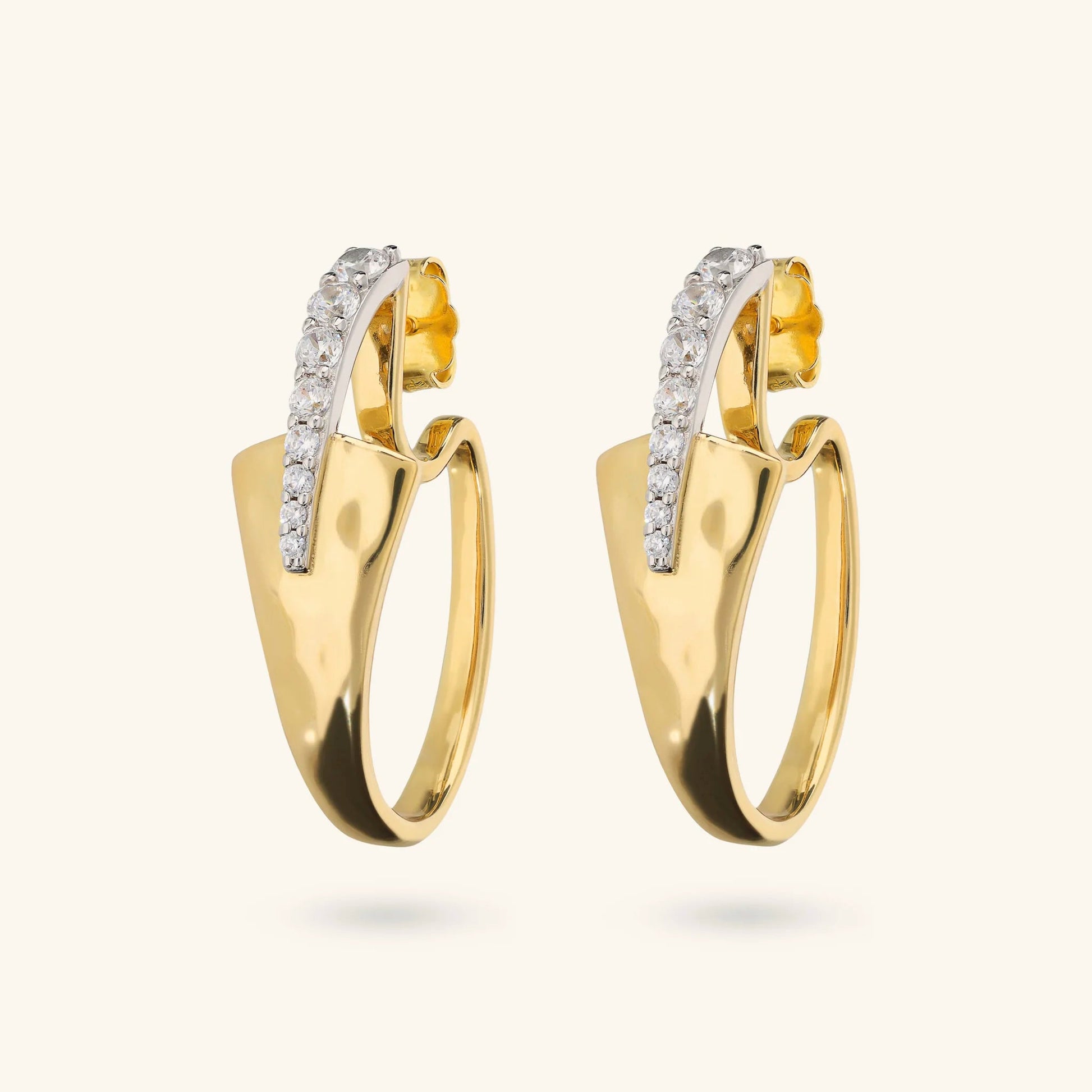 Orecchini a cerchio Etrusca Gioielli realizzati in lega Golden, placcata Oro giallo 18kt, dal design ovale con superficie martellata e in pavé di cubic zirconia. Chiusura a perno e farfalla.