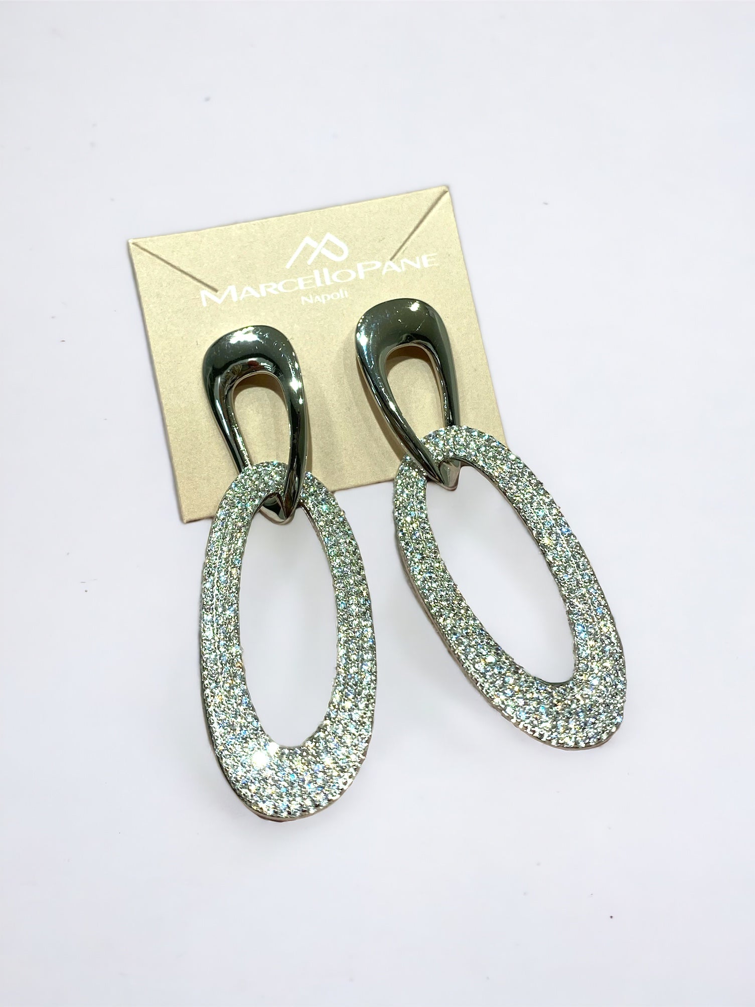 Orecchini da Donna in argento 925 con un doppio pendente ovale, di cui uno piccolo di 2 cm circa a lavorazione lucida e l’altro più grande 3,5cm con zirconi bianchi.