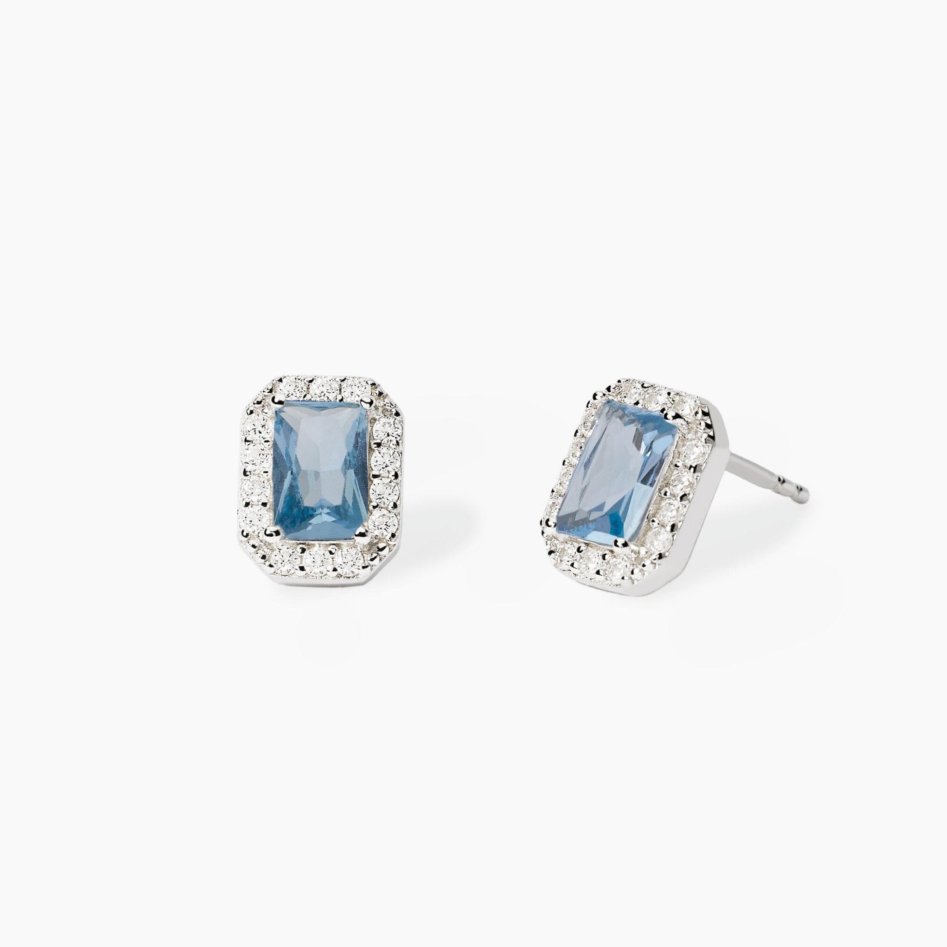 Orecchini a lobo in argento con zirconi bianchi e acquamarina sintetica taglio baguette.