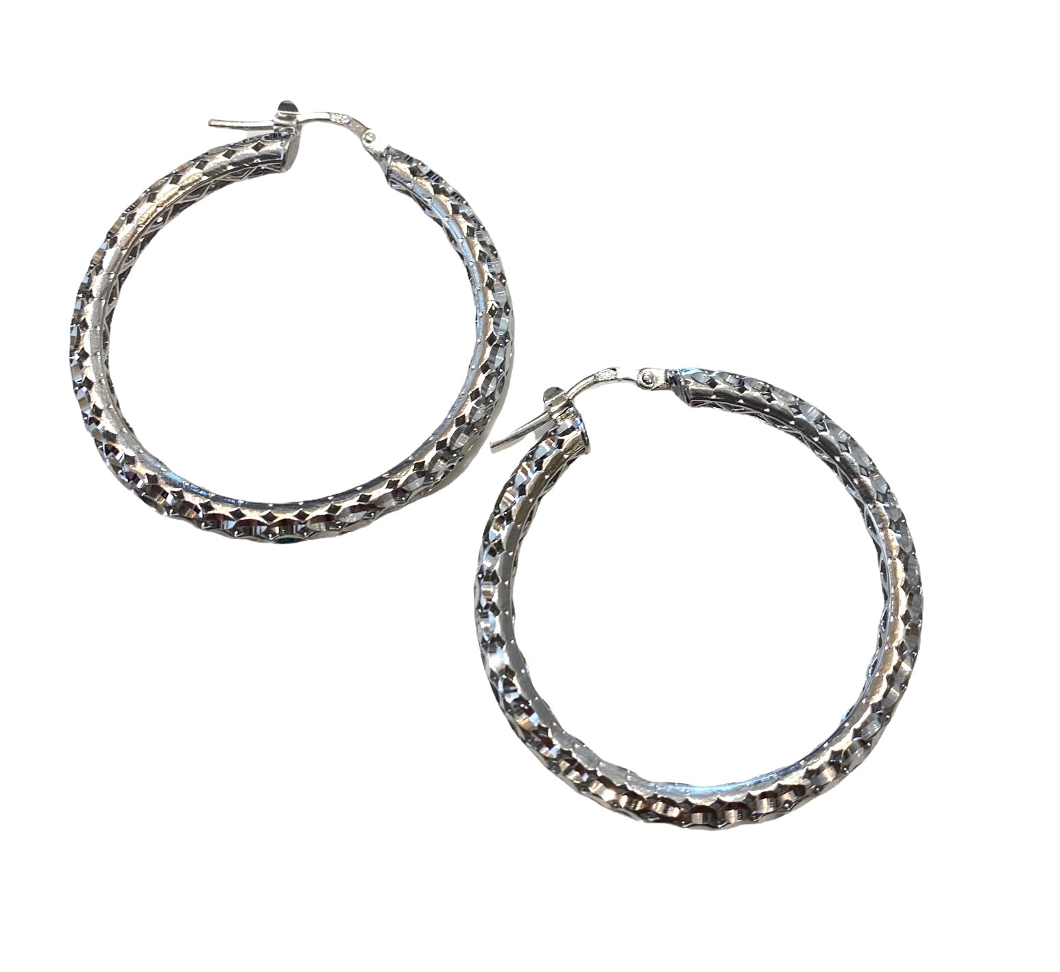 Orecchini a cerchio in argento 925, chiusura a perno, impreziositi da una lavorazione ad intaglio con effetto diamantato. Diametro di 3,5cm.