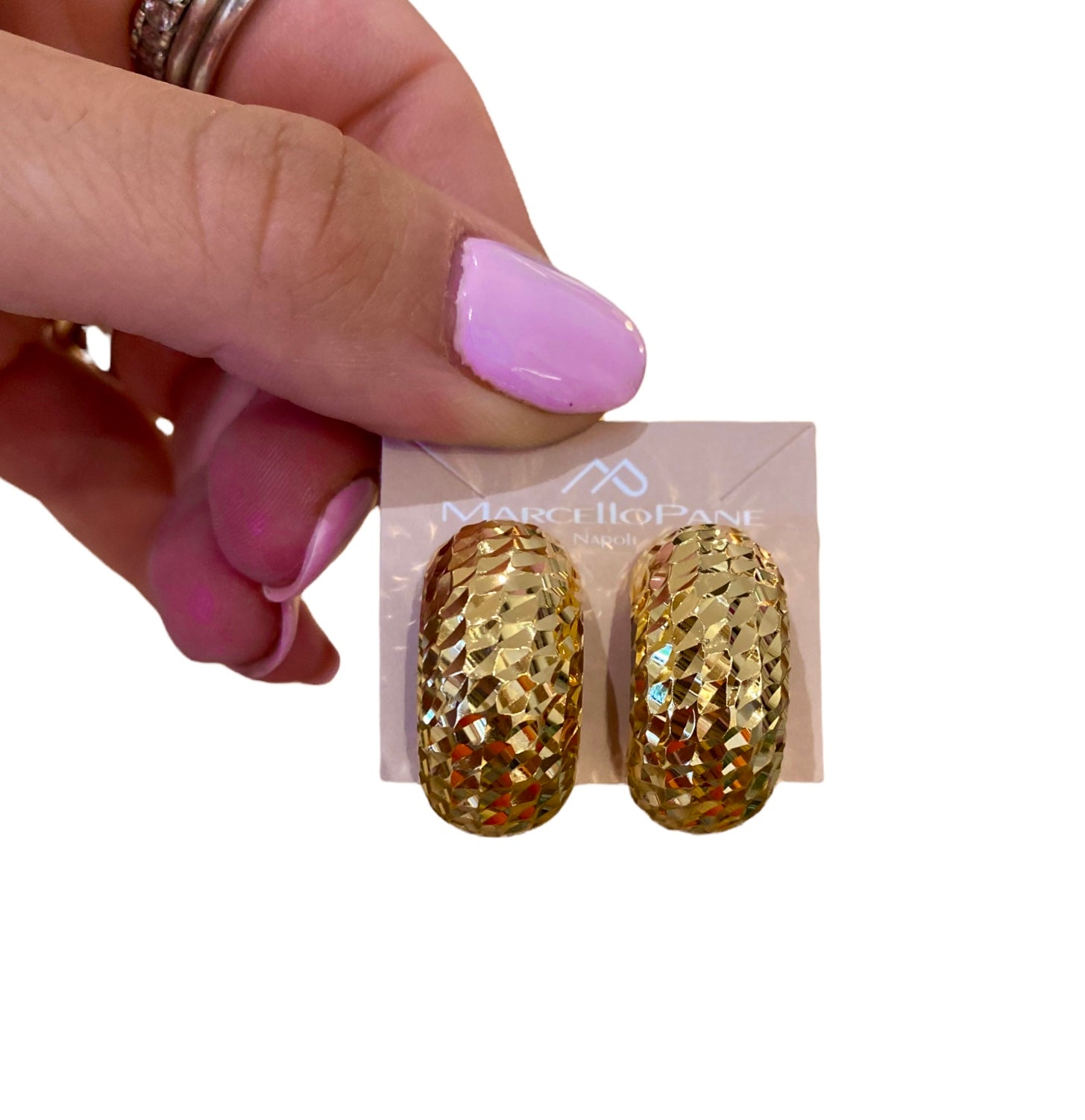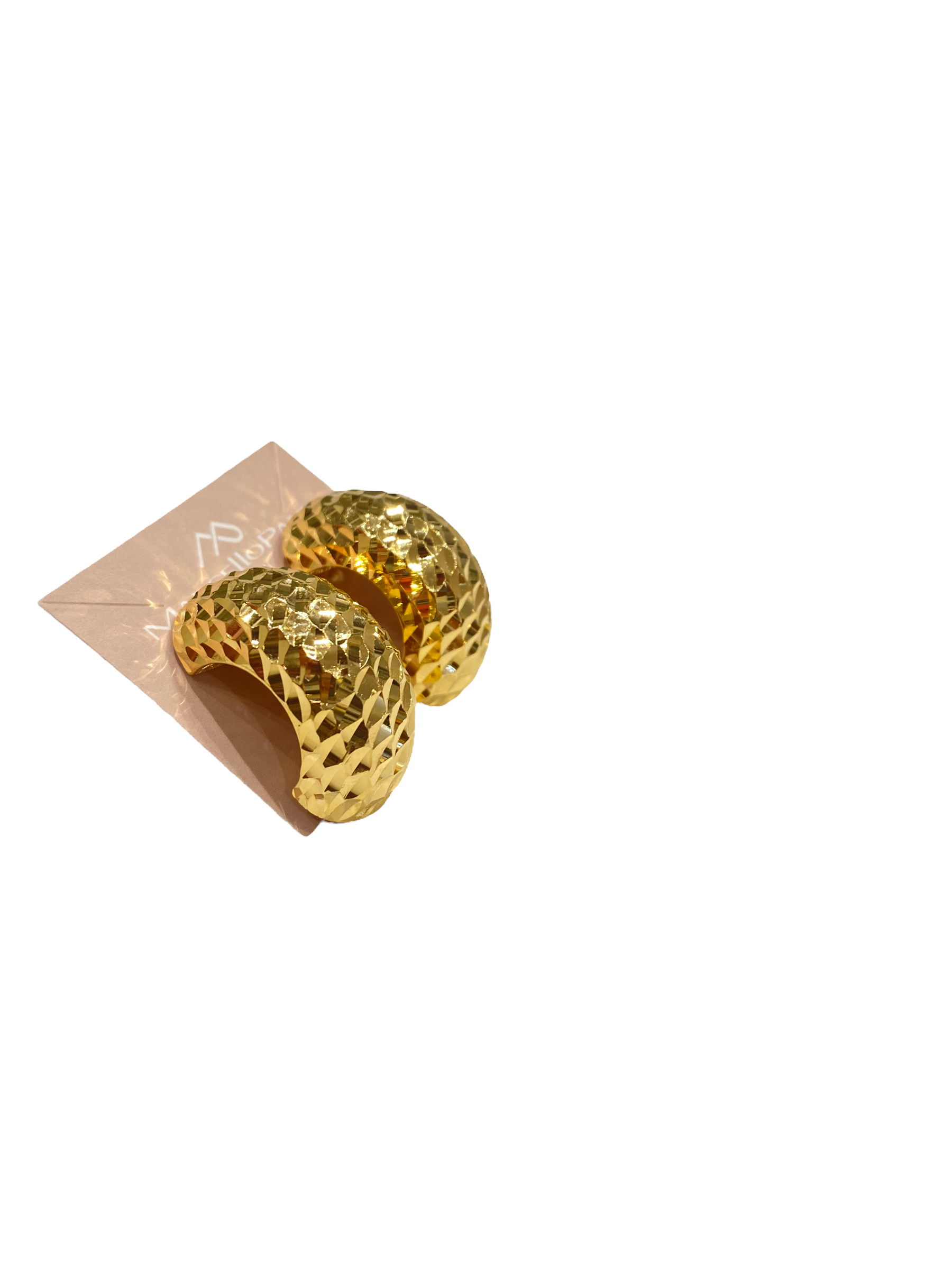 Orecchini a semi-cerchio a lobo in argento 925 con placcatura in oro giallo, chiusura perno e farfalla, impreziositi da una lavorazione ad intaglio. Lunghezza totale di 2,5cm.