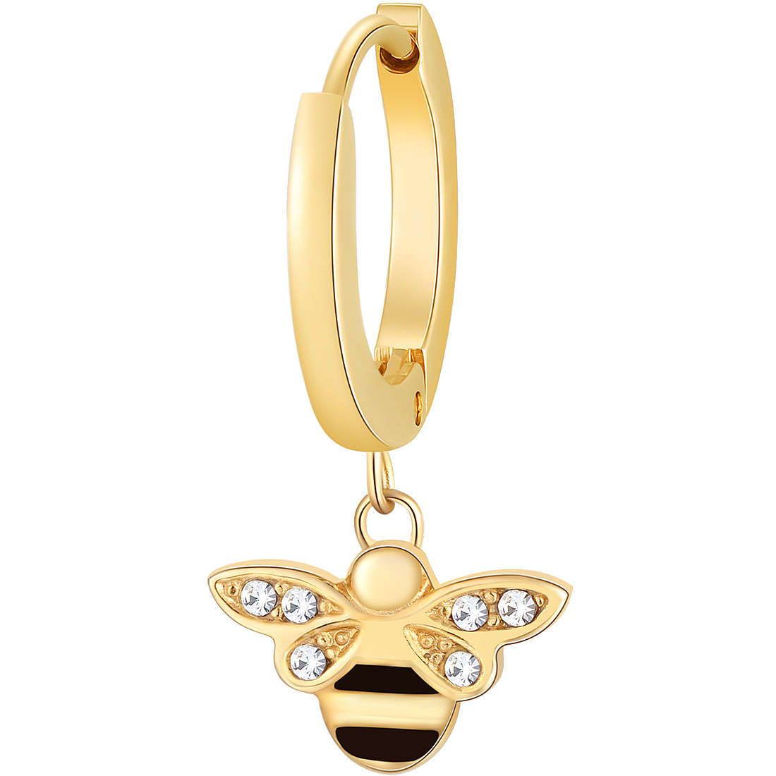 Orecchino singolo in acciaio 316L e finitura oro con pendente a forma di ape con smalto nero e cristalli.