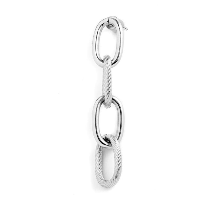 Mono orecchino in acciaio con catena a maglia larga liscia e maglia con texture alternate. Lungezza totale 45 mm. Materiali: acciaio