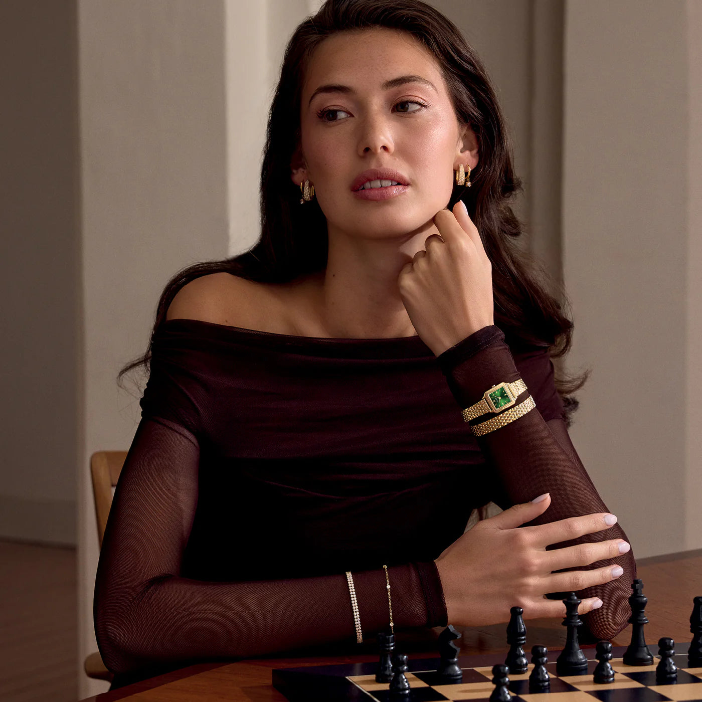 L'orologio quadrato Gracieuse Mini da donna è caratterizzato da una cassa color oro da 21 mm, quadrante verde foresta e cinturino doppio in acciaio inossidabile color oro da 12 mm.