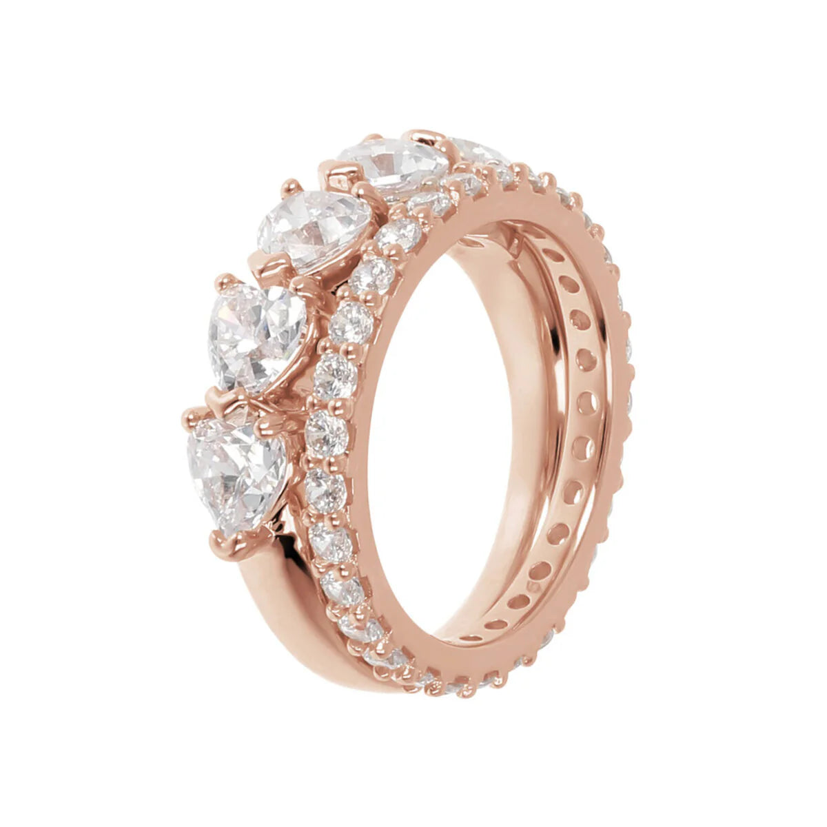 Set di anelli Bronzallure realizzati in lega Golden Rosé, placcati oro rosa 18kt. Il set è composto da un anello riviera con cuori in cubic zirconia e da un anello veretta interamente ricoperto da piccole e raffinate cubic zirconia.